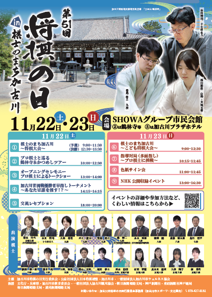 将棋界最大のイベント「将棋の日」を、”棋士のまち”である加古川市(SHOWAグループ市民会館)で開催します。 平成21年以来16年ぶりに開催する今回は、総勢20名のプロ棋士とともに、さまざまなイベントを行います。皆様のご来場をお待ちしております!